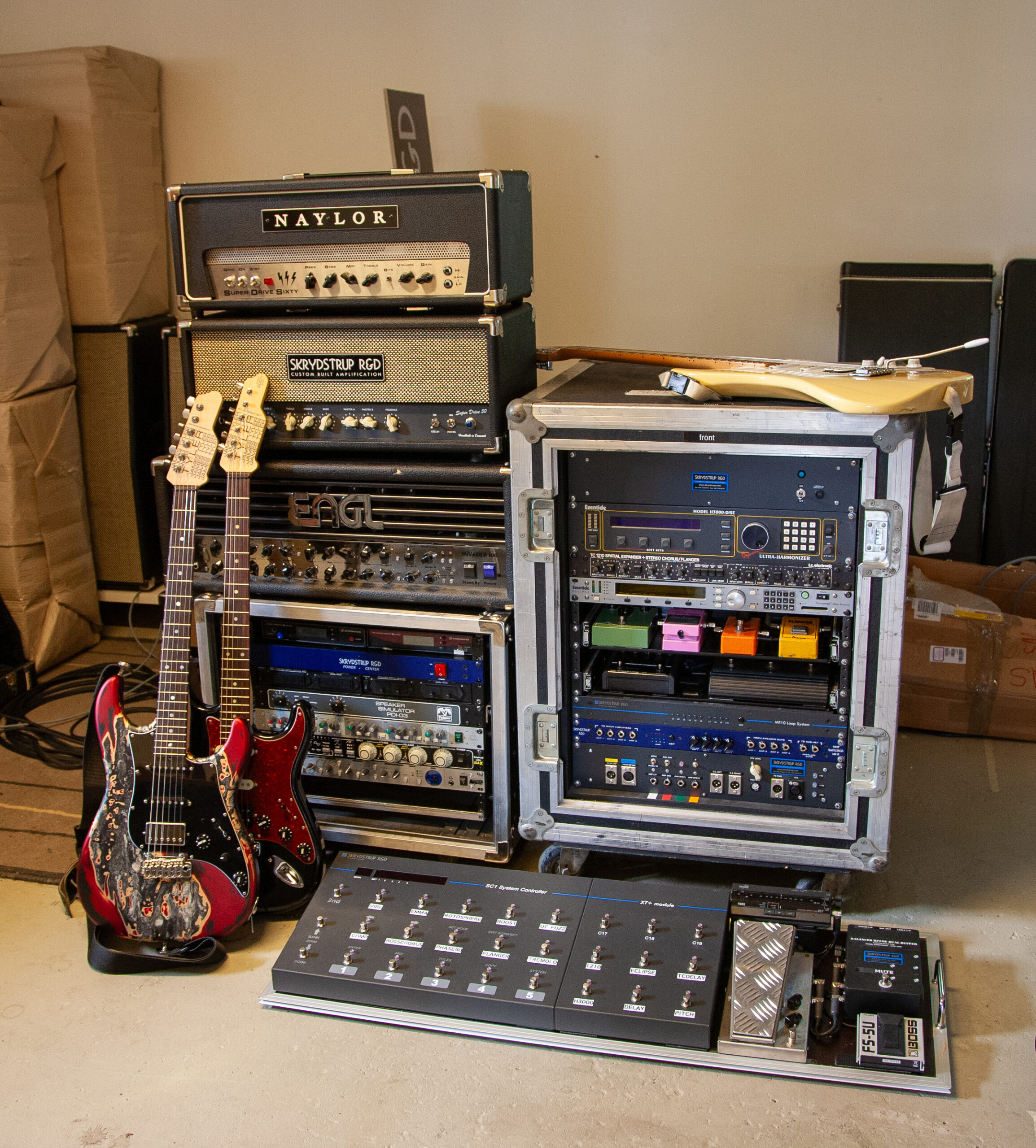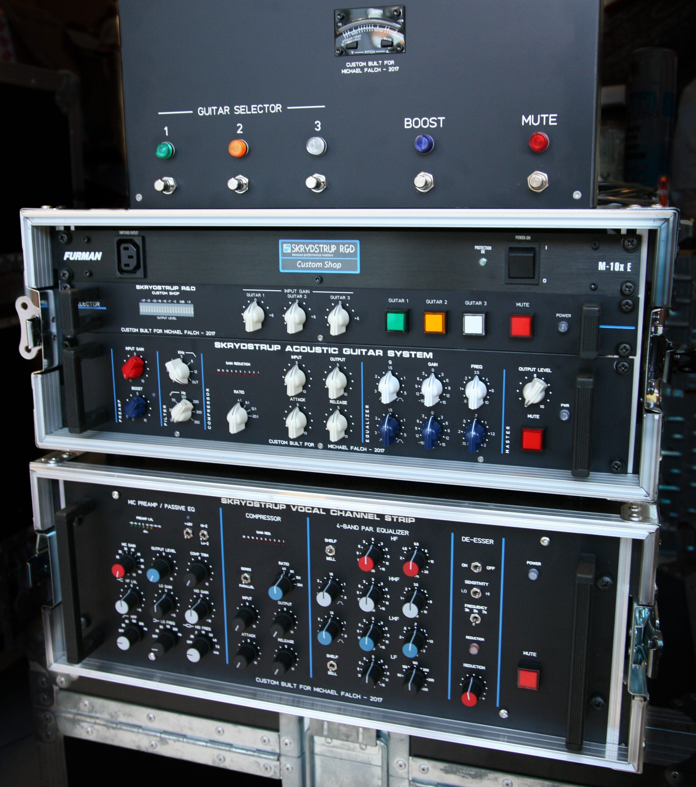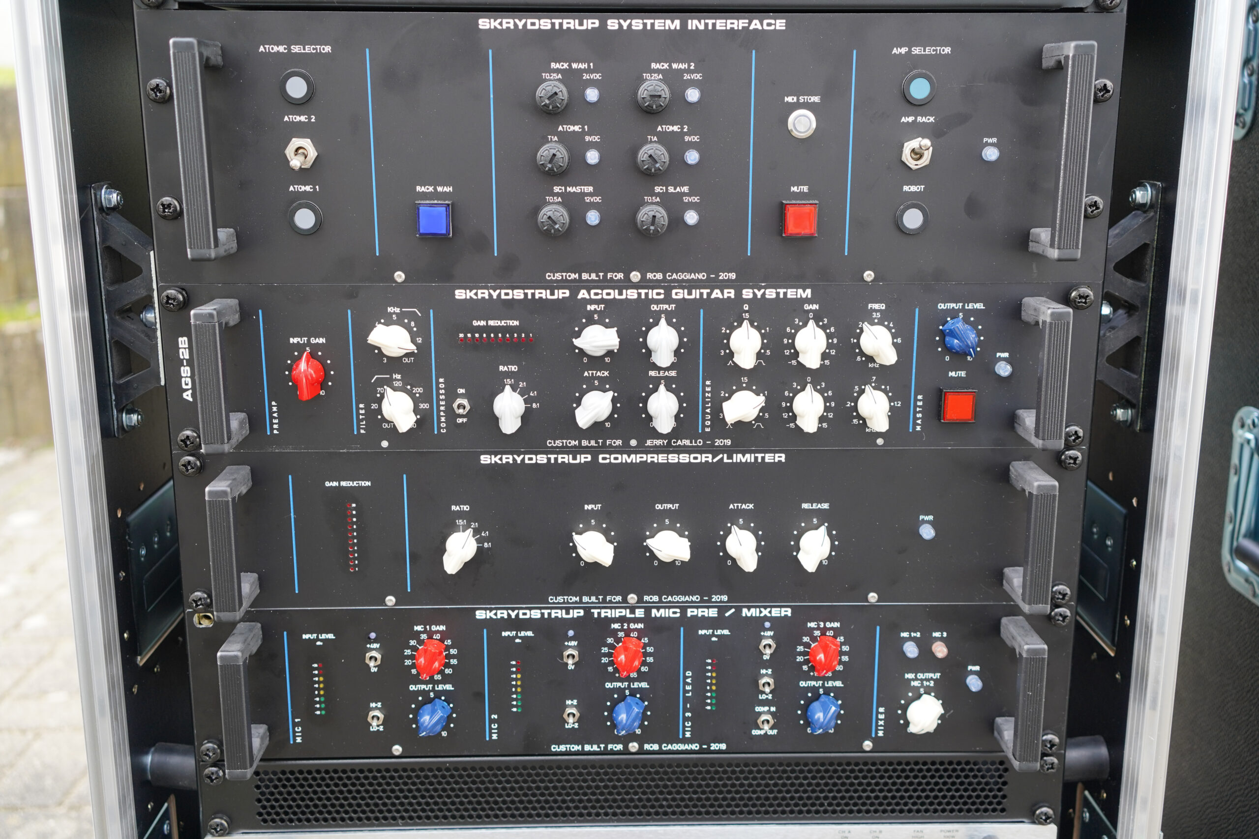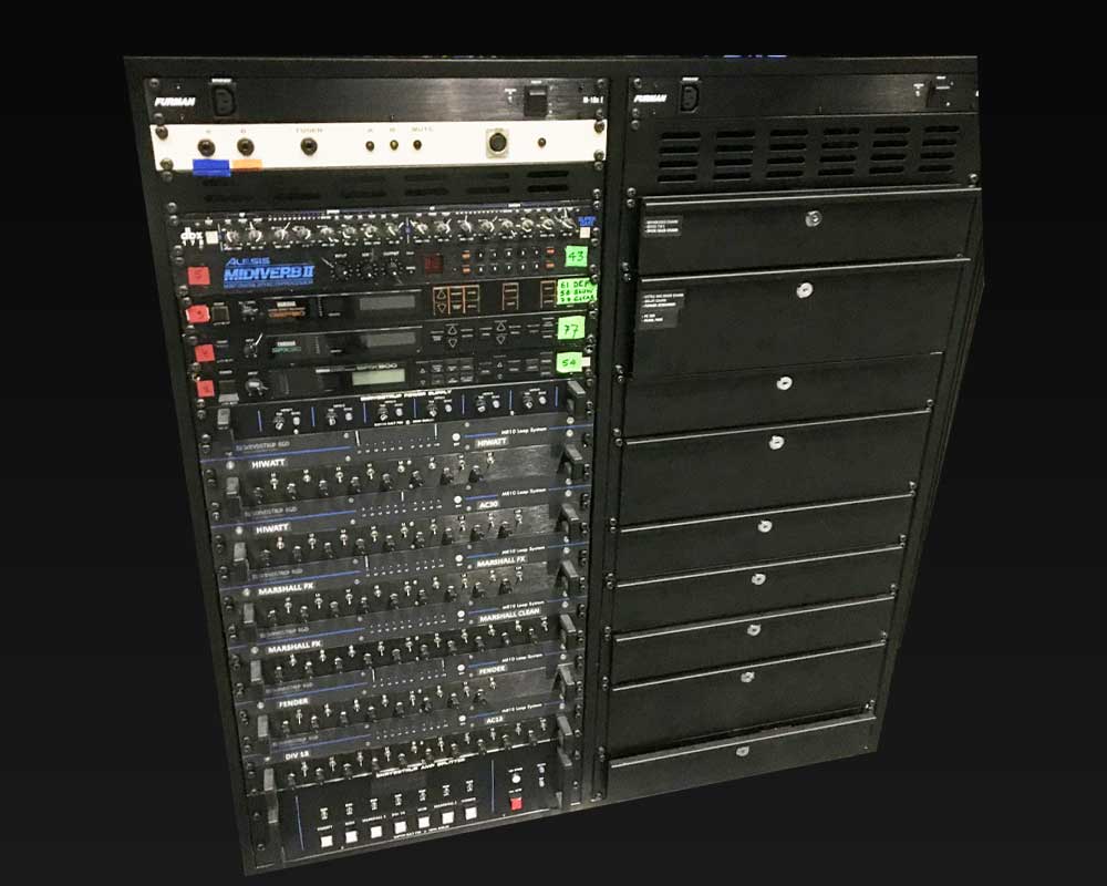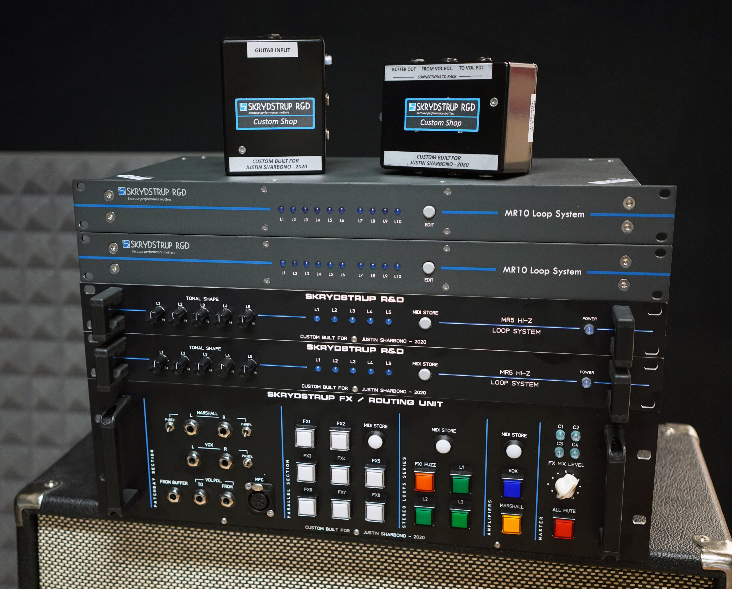 Rob Caggiano asked me to build his touring rig for Volbeat’s world tour in 2019. It includes Custom Shop (CS) I/P Selector, CS System Interface, CS Amp Selector, CS Compressor/Limiter, CS Triple Mic Pre amp, MR5 Loop System, ACC1 Acoustic Guitar System and SC1 Midi Foot Controller.