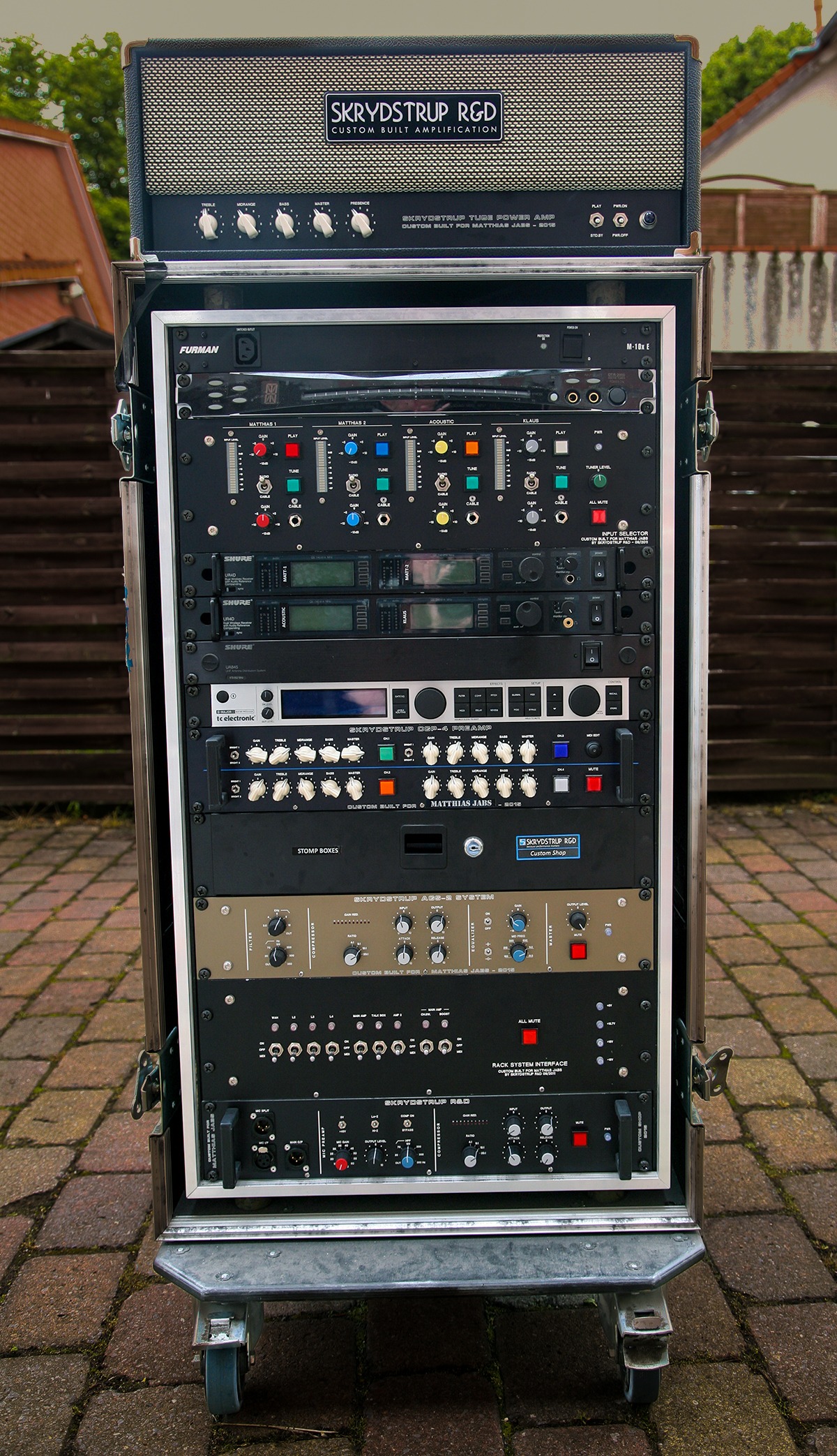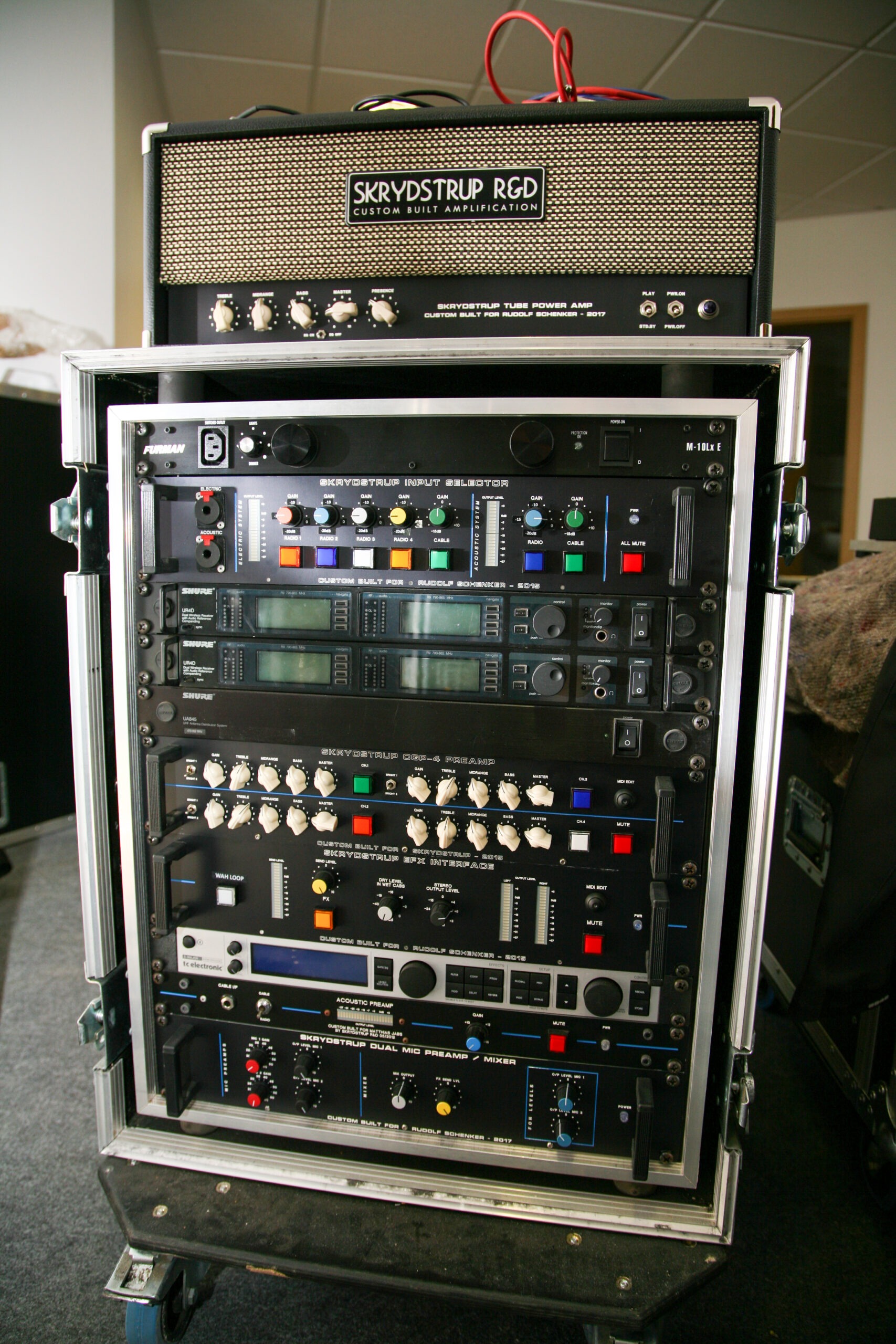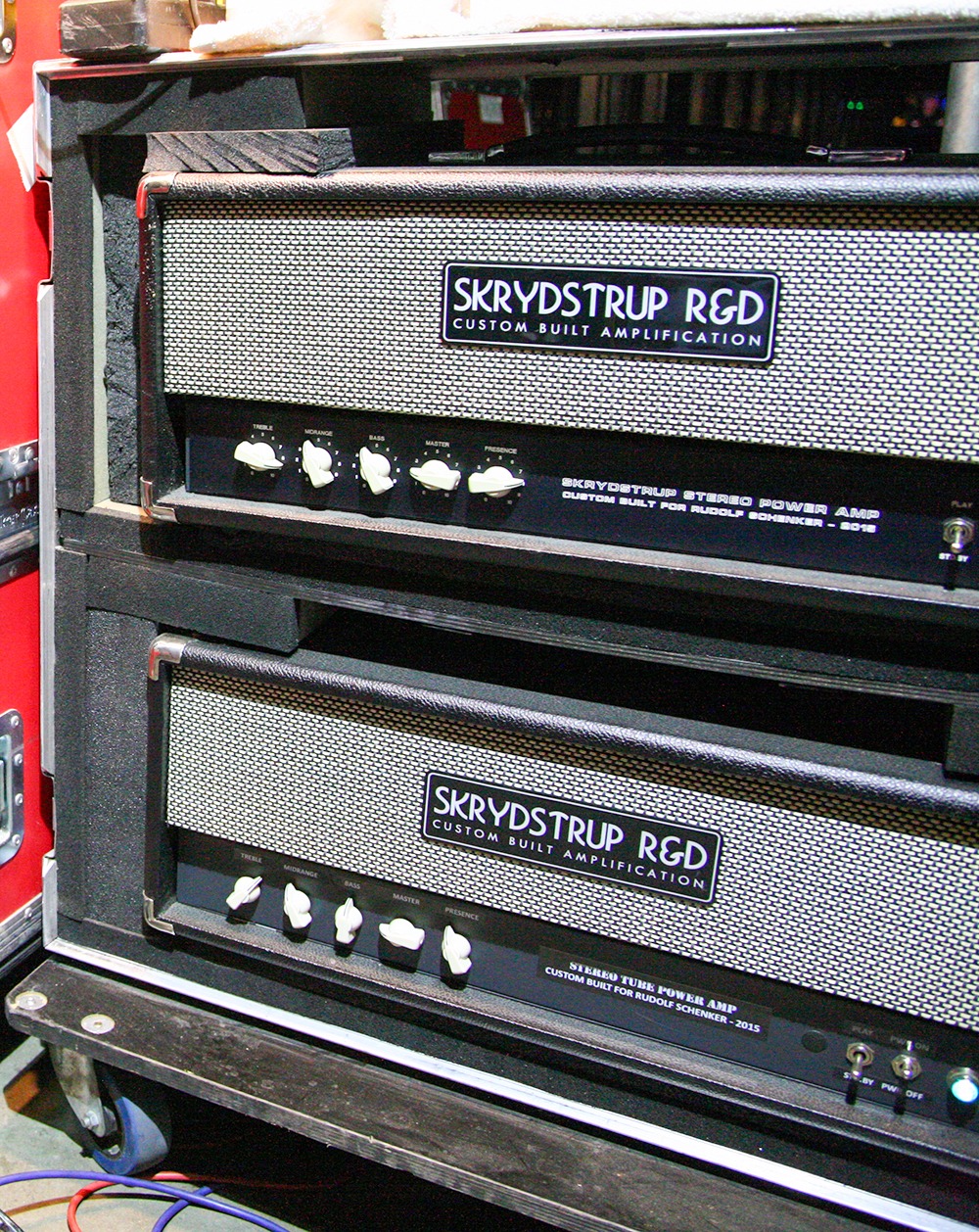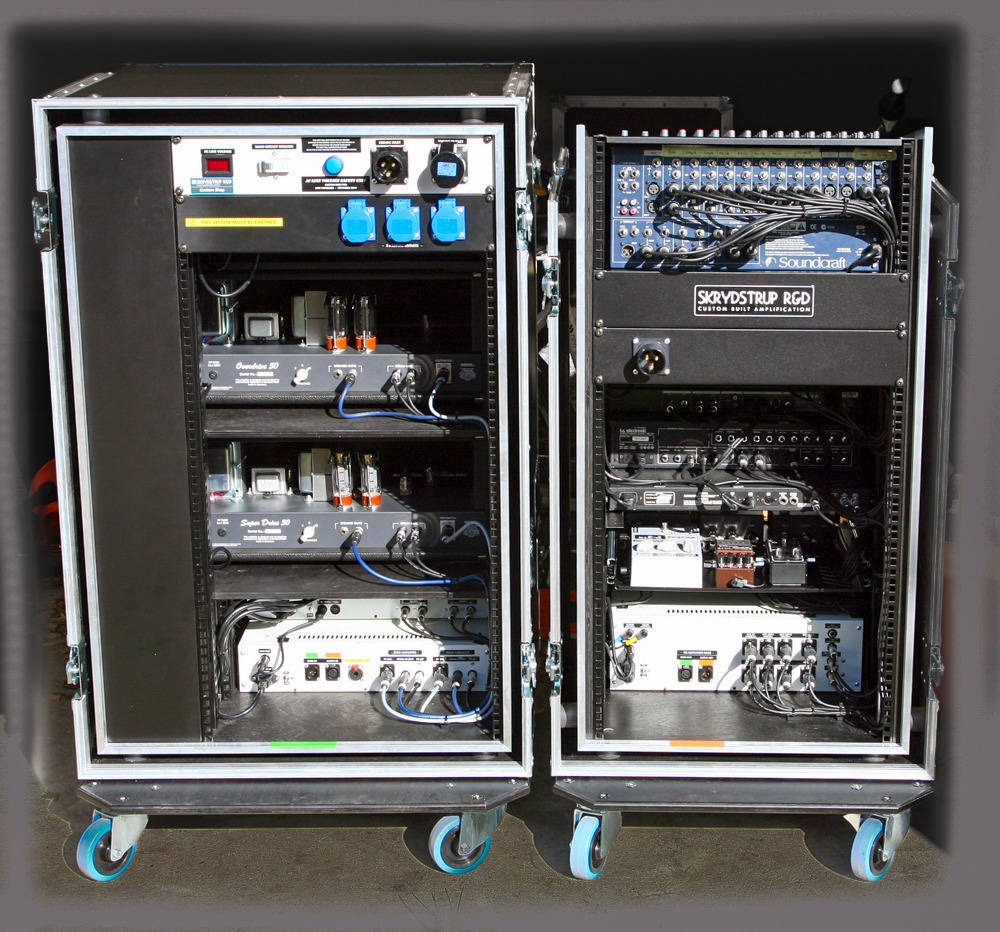 I started working with Rudolf Schenker back in 2012. He ordered the SD50 Tube Amp Head and the OD50 Tube Amp Head – and upon the request of Rudolf Schenker and his Tech Peter Kirkman – I developed the TD50 TripleDrive Tube Amp Head. In 2013 I developed the very first AGS Acoustic Guitar System for the 2014 Scorpions MTV Unplugged Tour for Matthias Jabs and Rudolf Schenker. Below are some of the Custom units and Live rigs.