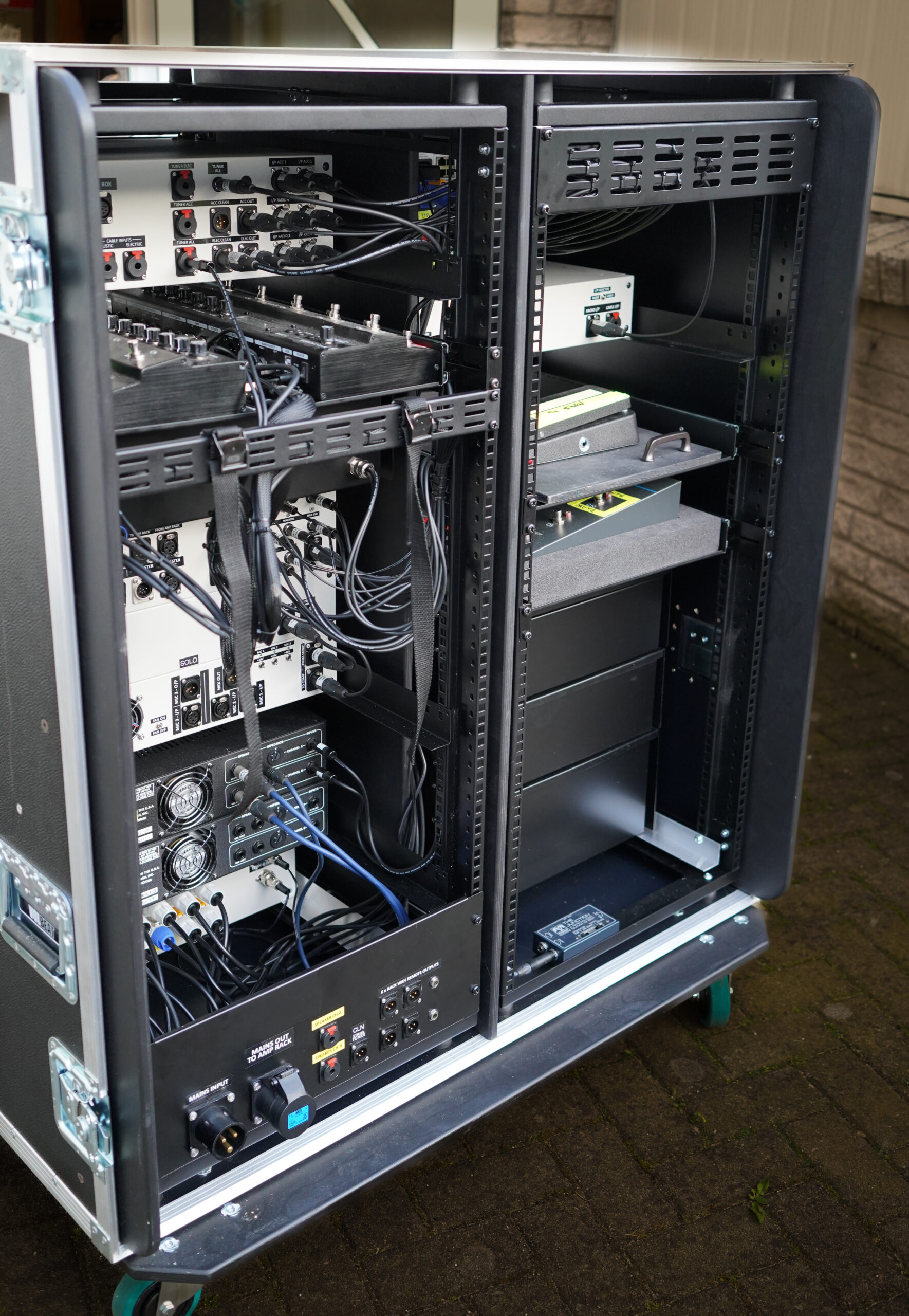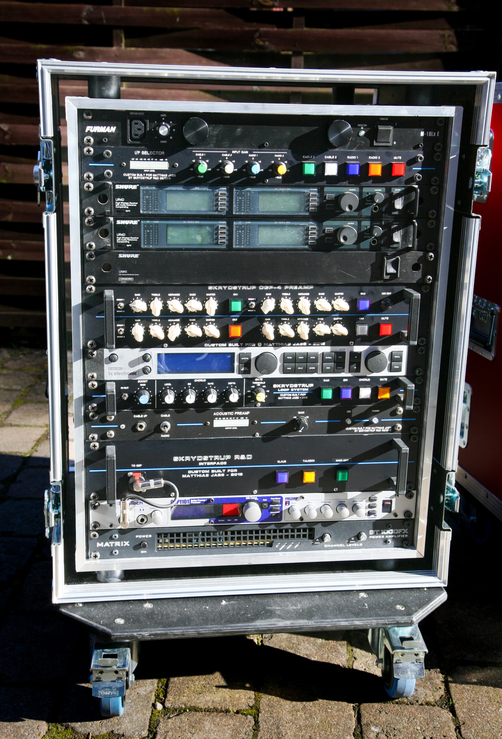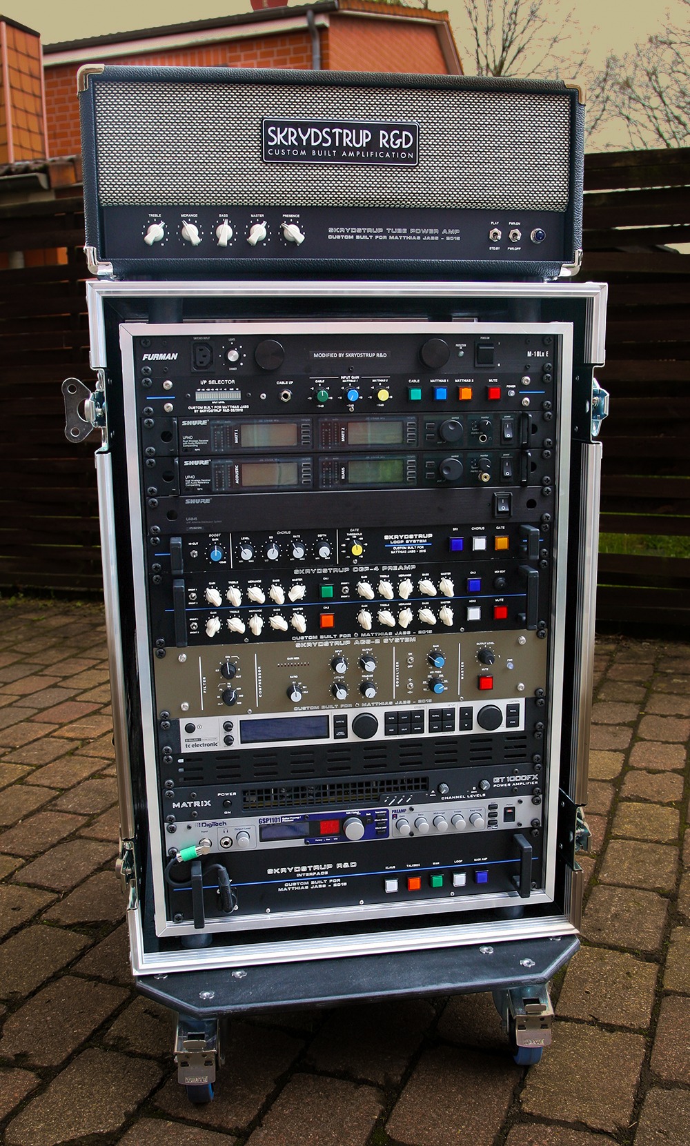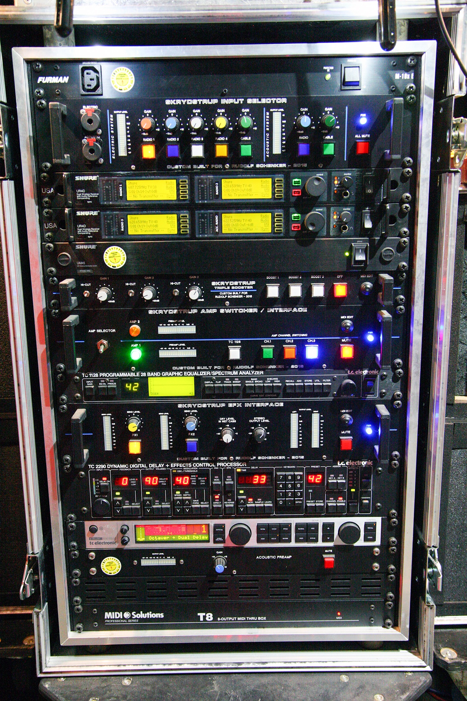 I started working with Rudolf Schenker back in 2012. He ordered the SD50 Tube Amp Head and the OD50 Tube Amp Head – and upon the request of Rudolf Schenker and his Tech Peter Kirkman – I developed the TD50 TripleDrive Tube Amp Head. In 2013 I developed the very first AGS Acoustic Guitar System for the 2014 Scorpions MTV Unplugged Tour for Matthias Jabs and Rudolf Schenker. Below are some of the Custom units and Live rigs.